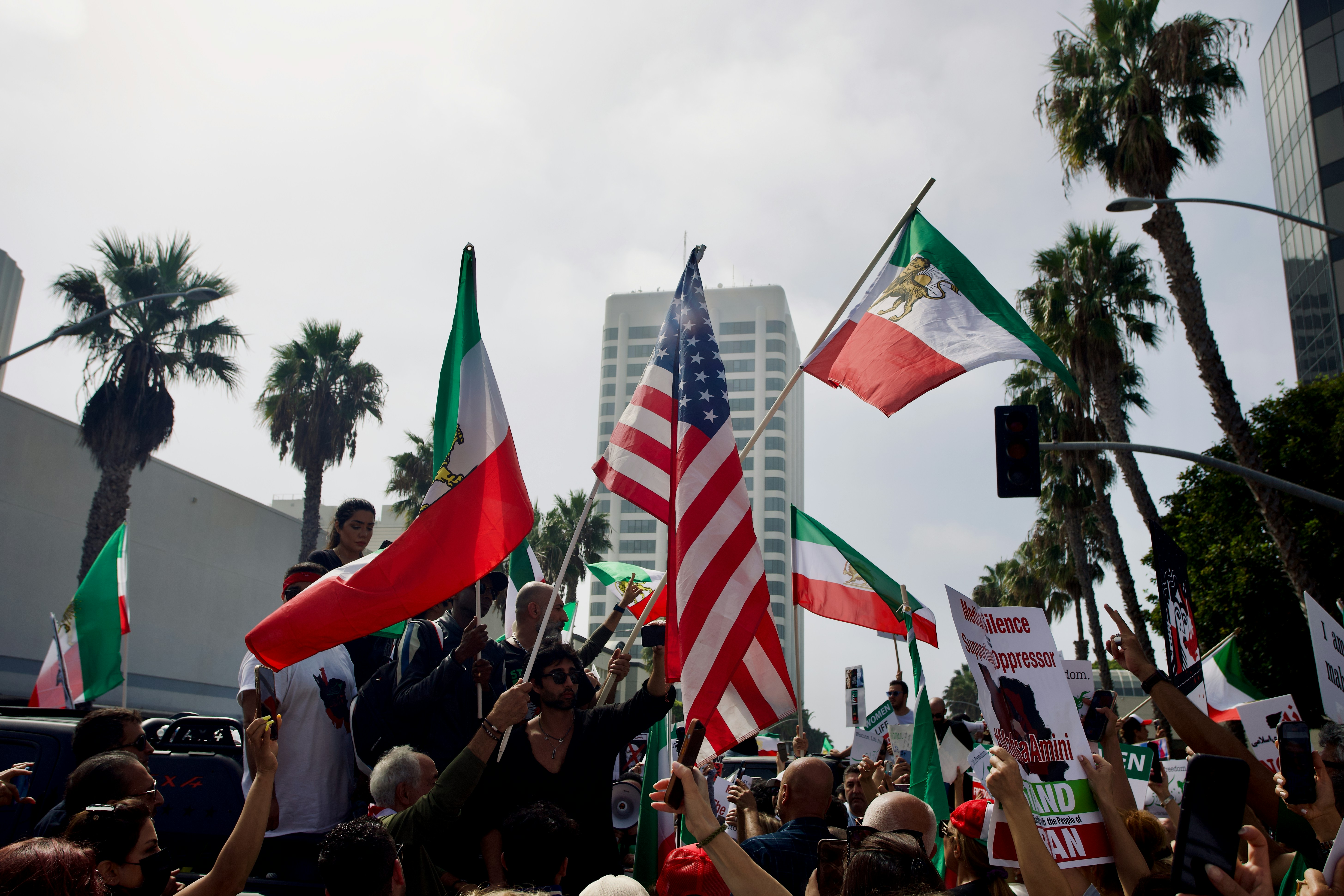 In Los Angeles, the Iranian diaspora gathered by the thousands. Pre-1979 flags everywhere. Chants of “Freedom!” echoing through the streets.